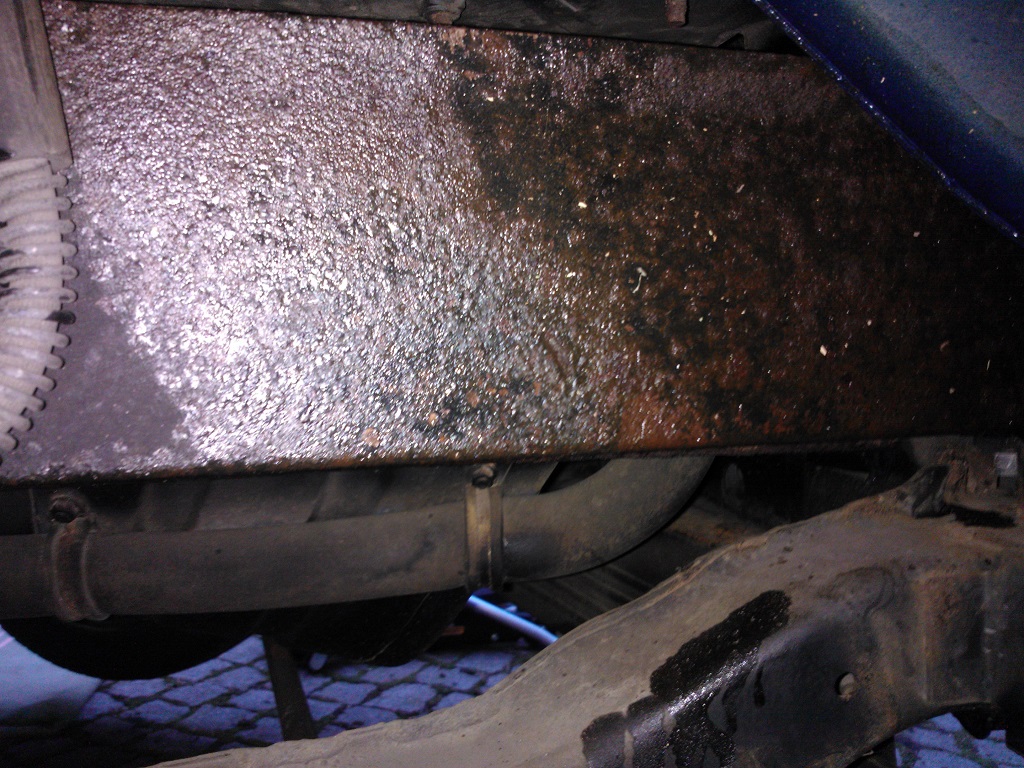 Ich würde kurzfristig erst mal versuchen so gut es geht im eingebauten zustand zu bearbeiten bevor ich den ganzen Hilfsrahmen gegen einen Pulver-beschichteten und Hohlraum-versiegelten tausche. Zur Zeit sind dort auch mehrere Schichten Owatrol drauf. Desswegen leuchtet es auf den Fotos (mit Blitz) auch so. Die Owatrol Schicht sieht aus wie ein Klarlack.