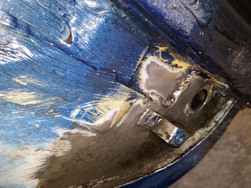 Solange die Öse da noch drin ist kommt man nicht ran. Wegflexen will ich sie nicht, weil ich mir nicht zu traue eine neue zu fertigen bzw. ich nicht schweißen kann. Habe halt kein Werkzeug. Ich habe lediglich eine 115er Flex mit Negerkeks sowie 50er und 100er CBS Scheiben für die Bohrmaschine. Am Ende habe ich Drahtbürstenaufsätze genommen, was das einzige war, wo man ansatzweise ran kam. Der Rest mit Schleifpapier und Perlox RE Rostentferner in 3 Durchgängen. (Bild direkt nach dem neutralisieren, daher Flugrost) Dateianhang: