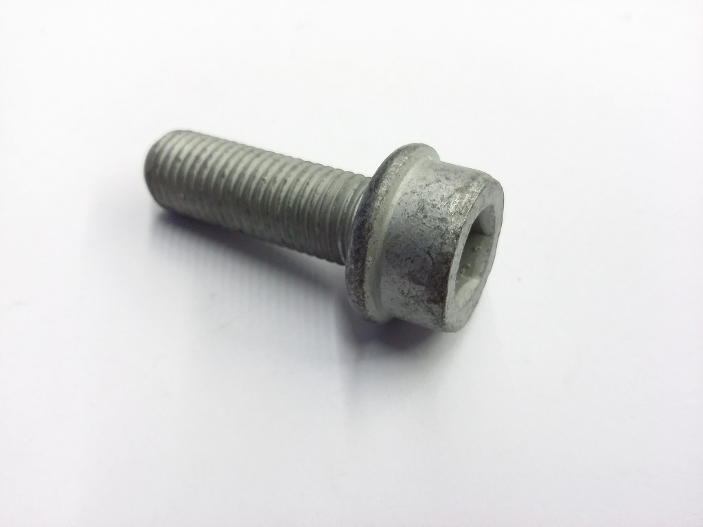 Auf der Rechnung ist die Teilenummer ersichtlich und die Schraube sieht so aus und ist 10.9 Innensechskant mit Riffelung am Bund (da erspart man sich den Sprengring, der sowieso gaga geht), M10x1,25x35. Ist a bisserl zu lang, aber geht sich aus mit der Bremsscheibe. Kann man auch abflexen, ist aber nicht notwendig. Wird mit 85 Nm angezogen! Also ordentliches Werkzeug benutzen. EPC-Nummer: EJP6293