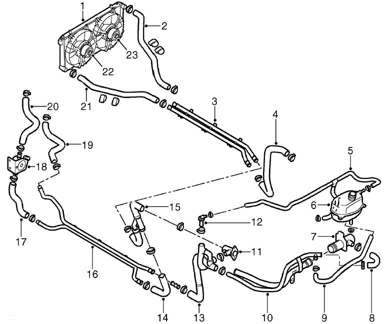 Heißes Wasser kommt durch den Stutzen (11) und den Schlauch (15) ins rechte Unterbodenrohr und fließt dann durch Schlauch (2) oben in den Kühler. Unten wieder raus, dann durch Schlauch (21) und das linke Unterbodenrohr zurück zum Schlauch (4), von da aus durch das dickere Rohr vom Rohrgeweih (10) zum Thermostat (7).