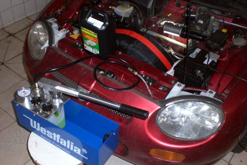 Diese Entlüftung habe ich aber nicht benutzen müssen, da man den ganzen Schlauch vor dem Verbinden mit der Pumpe mit Hydrolasticfluid füllen kann,so dass keine Luft ins System kommt. Aber man könnte hier bei Bedarf, dann aber über einen Absperrhahn, eine Vakuumpumpe anschließen.