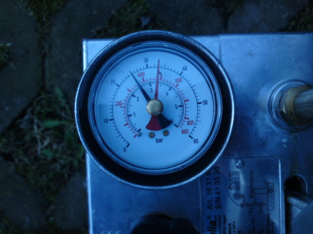 So, hier nun das Ergebnis meiner Selbstbaupumpenaktion :up: Ist ziemlich einfach, anklemmen, entlüften dann schön aufpumpen. Zwischendurch immer mal wippen und messen. Ich hab auf ca. 30bar aufgepumpt auf beiden Seiten und es scheint zu passen. Das werde ich nun erstmal nen Tag "sacken" lassen und morgen noch mal messen und ggf. korrigieren.