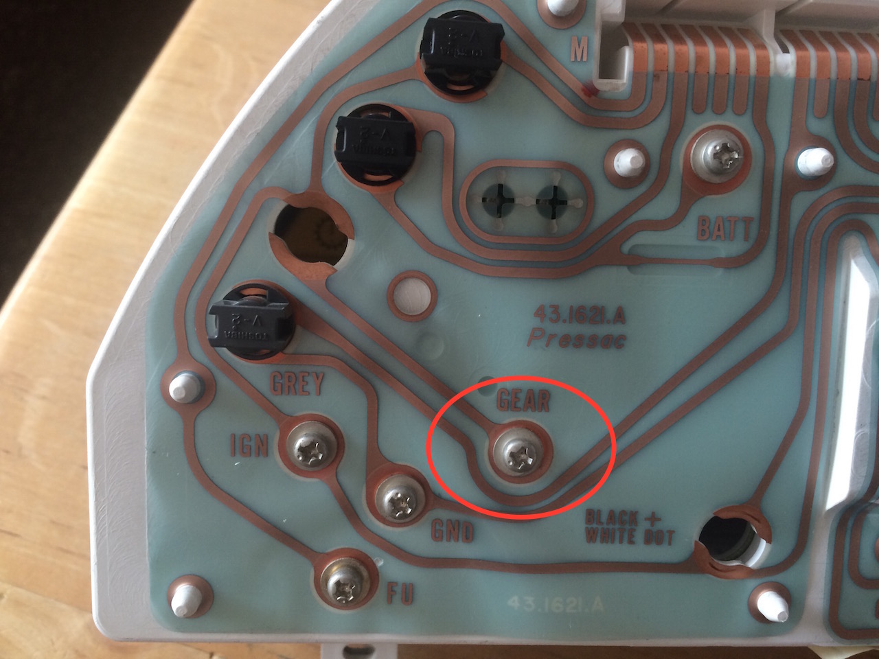 . Also (von unten nach oben): Leiterbahn, Schraubklemme, Iso-Scheibe (durch die klemme durch!), Schraube. Die Schraube verbindet eigentlich das Lämpchen mit der Elektronik der Schaltstufenanzeige im Tachoblock, und da wollen wir ja keine 12 V drauflegen.