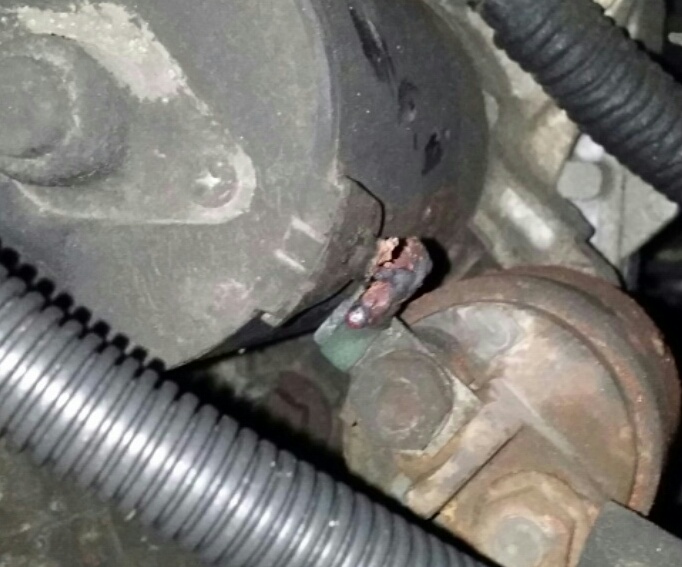 Auweh, der muss wohl raus. Da ist das Kabel vom Magnetschalter zum Anlasser durch. Kann man aber löten, musst “nur” den Anlasser für zerlegen.  Und du brauchst ein ordentliches Brateisen dafür, mit der Feinelektronik-Lötstation wird das eher nichts. Nachtrag: Du könntest ja (wenn du drankommst) mal die “Lucas-Reparatur” probieren, und einfach ein Kügelchen Stanniol dazwischen drücken, um wieder Kontakt zu kriegen. Aber aufpassen, dass es nirgendwo einen Kurzen gibt! Das könnte fürs Erste reichen.
