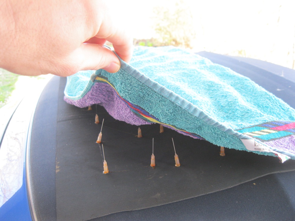 Also nahm ich ein Stück Gummimatte, klebte einige Kanülen drauf und bedeckte das ganze mit (s)einem alten Katzenhandtuch: