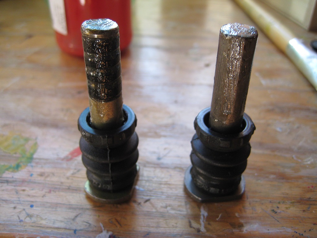 Ich würde einfach mal stumpf behaupten das der eine die alte Bauform hat ohne Beschichtung und der andere die neuere Bauform mit Beschichtung Wenn es denn die schiebestücke vom bremssattel sind