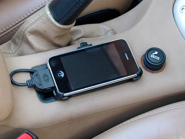 Ich hab die Innereien aus dem Aschenbecher rausgenommen, Deckel inklusive. In den Rahmen davon passt wunderbar eine Pfennigs-Universal-iPhone-Halterung von Rudis Resterampe oder so rein. Die Dinger haben alle denselben Anschluss, diese vier Bügel zum raufschieben, also denke ich mal, dass die hintenrum alle gleich sind. Der Buckel hinten schmiegt sich schön in den Aschenbecherrahmen rein. Das Kästchen mit der Ladeelektronik ist unten drin, zur Zugentlastung mit zwei Kabelbindern an der Halterung hinten befestigt und das Versorgungskabel durch das Scharnierloch der Klappe raus, z.B. direkt zum Zigarettenanzünder. Dann die Halterung in den Aschenbecherrahmen reingeklebt, fertig. Sitzt an der optimalen Stelle für die Finger, ist auch witzigerweise recht blendfrei dort. Mit dem Telefon navigieren tu ich nicht, hab ich probiert, immer wenn ich an einer komplizierten Stelle angekommen war hat irgendwer angerufen und die Navigation hatte Pause. Kleben kann man mit Sekundenkleber (so wie ich) oder mit doppelseitigem Außenklebeband, das Zeug, womit man auch Nummernschilder montieren kann.