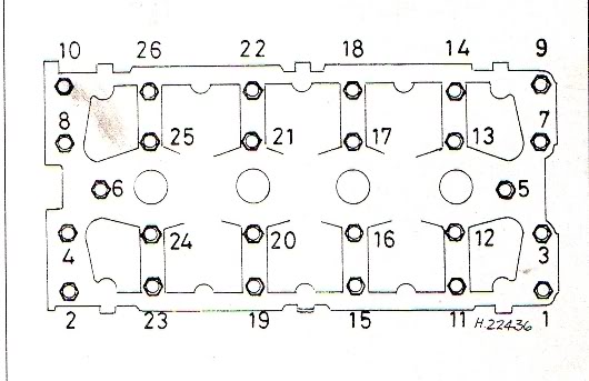 Die Anzugsreihenfolge stimmt, aber der VVC hat ein paar Schrauben mehr (32 statt 26), wegen der Ventilsteuerung. Steht 3 Seiten weiter, allerdings mit ein paar Druckfehlern.  Im Prinzip gilt da, die 4 längeren Schrauben in die Ecken, und dann von der rechten Einlassseite her (WaPu-Seite) immer von Einlass nach Auslass festziehen. Die zwei Mittelschrauben werden zusammen mit der ersten und letzten Reihe in der Folge mit angezogen. Ansonsten eher so wie in dem Bild mit der blauen Masse. Die Dichtmasse kommt allerdings auf die Dichtflächen im Kopf, eine dünne Wurst ziehen (ca. 1 mm) und dann mit einer Rolle gleichmäßig dünn ausbreiten. Wenn was in die Leitungen oder Löcher kommt, wieder rauspopeln vor dem Zusammenbau.