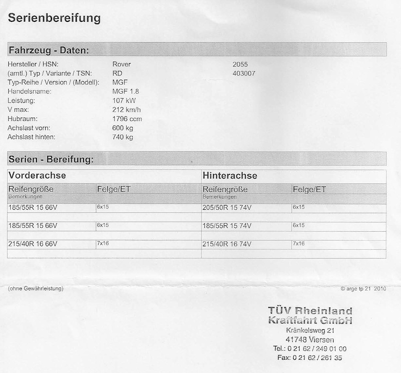 Offiziell sind in der Betriebserlaubnis laut meinem TÜV-Ingenieur folgende Kombinationen eingetragen (außer Trophy): vorn 185/55R15 66V hinten 185/55R15 74V oder vorn 185/55R15 66V hinten 205/50R15 74V … auf Felge 6Jx15, ET28mm oder vorn 215/40R16 66V hinten 215/40R16 74V … auf Felge 6Jx15, ET28mm auf Felge 7Jx16, ET28mm, wie die abgebildeten Hairpin-Felgen (die geilsten!). Die V-Geschwindigkeitsindexe sind für den VVC, beim MPI reicht natürlich auch H. Andere Kombinationen sind prinzipiell möglich, wie ja auf der von Nikos geposteten Bescheinigung von MG Rover auch draufsteht muss das allerdings von einem "amtlich anerkannten Sachverständigen begutachtet und im Fahrzeugbrief dokumentiert" werden. Kannst ja mal mit dem Ausdruck von einem Scan einer Kopie einer Kopie eines Faxes mit nicht passender VIN und geschwärzten Halterdaten zu deiner TÜV-Prüfstelle fahren  .
