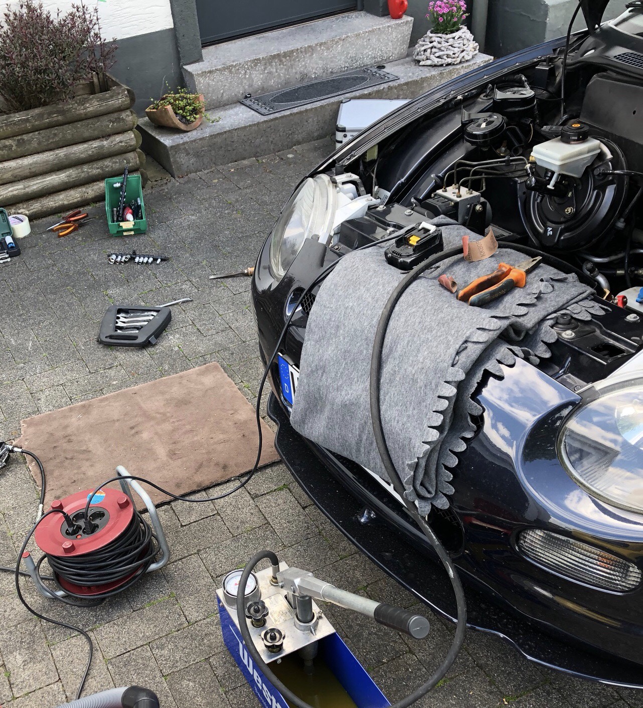 Der Einbau hatte einige Überraschungen für uns. Da war der Autoschlüssel.....oder eben auch nicht mehr und der Kofferraumdeckel war nicht mehr offen. War ein Erlebnis Golf zu fahren Dann war die1/4 Zoll Ratsche wie vom Erdboden verschluckt. Wir haben dann noch eine Methode entwickelt wie wir die hinteren Dosen beim Einbau wieder in die richtige Position bekommen haben. Dafür taten anschließend die Füße weh. Aber einen tot muss man bekanntlich sterben. Beim Aufpumpen klemmte ein Schraderventil und zum Schluss habe ich noch die Haustürklingelüberprüfungsfunktion gekillt. Die ganze Aktion hat 8 Stunden gedauert. Jetzt weiß ich wie Cadde sich fühlt  Auto fährt gut und liegt schön tief Irgendwie ändert sich bei mir die Reihenfolge der Bilder beim Hochladen immer