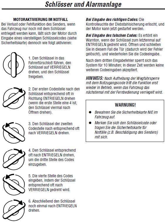 habe ein Problem mit meinem Schlüssel und müsste zum Neucodieren in die Werkstatt. Da er aufgrund der Wegfahrsperre nicht anspringt, müsste ich den Notzugangscode per Tür nutzten. Nun habe ich den Code, allerdings kein Handbuch[i][/i] und weiß nicht, ob nach Rechts und Links. Also z.B 2224 2xlinks, 2xrechts, 2xlinks, 4xrechts...oder halt anders...