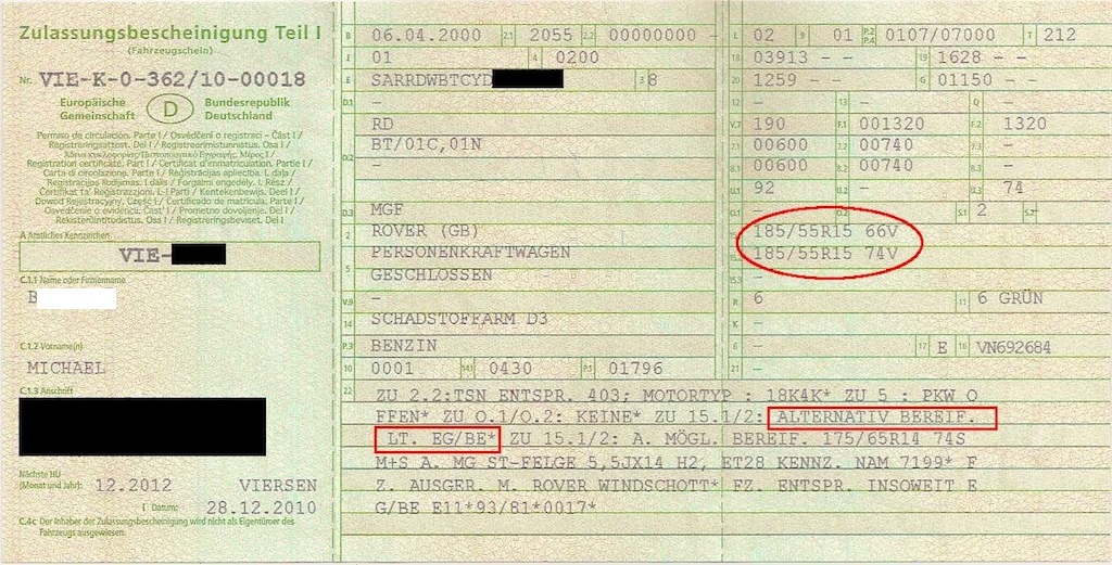 Da stehen noch nichtmal die 205/50R15 für hinten drin, mit denen alle frühen MGF ausgeliefert wurden, weil es eben zulässig ist, auch hinten 185-er zu fahren (z.B. Winterreifen!). Wichtig ist letztlich nur, was in der EG-Betriebserlaubnis alles aufgeführt ist. Ich habe noch nie mit einem MGF mit originalen Felgen Probleme bei der HU gehabt. Und ich war nun schon mit so einigen dort.