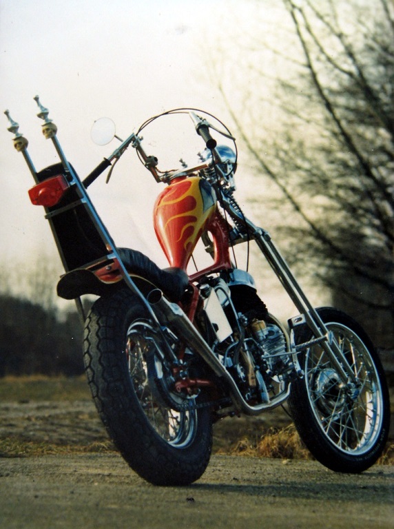 Das ist eine 45 CuInch (also 750er) WLA, also eine alte Militärharley Baujahr 1942. Luftgekühlter V2 mit 28 PS, gekauft als Schrott 1974, dann hergerichtet als Chopper und jetzt ist sie halt etwas verändert...  Sieht mittlerweile etwas anders aus (Lack und Lenker und Auspuff). Gibt bald ein aktuelleres Foto nachgereicht. Das Kreuz? Na ja, kannst dir ja denken bei ungefedertem Hinterrad.