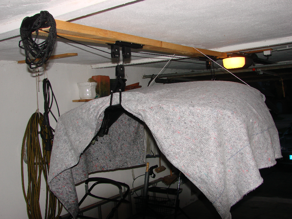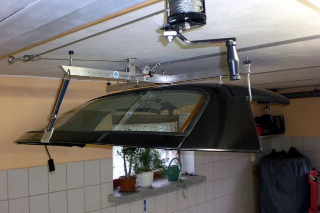 … kam mir die Frage,wie Ihr Euer Hardtop bei Nichtbenutzung verstaut (wenn Ihr eines habt). Da ich meines mangels fremder Hilfe alleine abnehmen und aufsetzen muss, habe ich mir für rund 8 Euronen so einen Flaschenzug mit zwei Doppelhaken gekauft, mit dem man sein Fahrrad unter die Decke hängen kann. Der eignet sich vorzüglich für das Hardtop, und ich kann einfach drunter fahren und es herablassen. Nur mal so als Tipp.