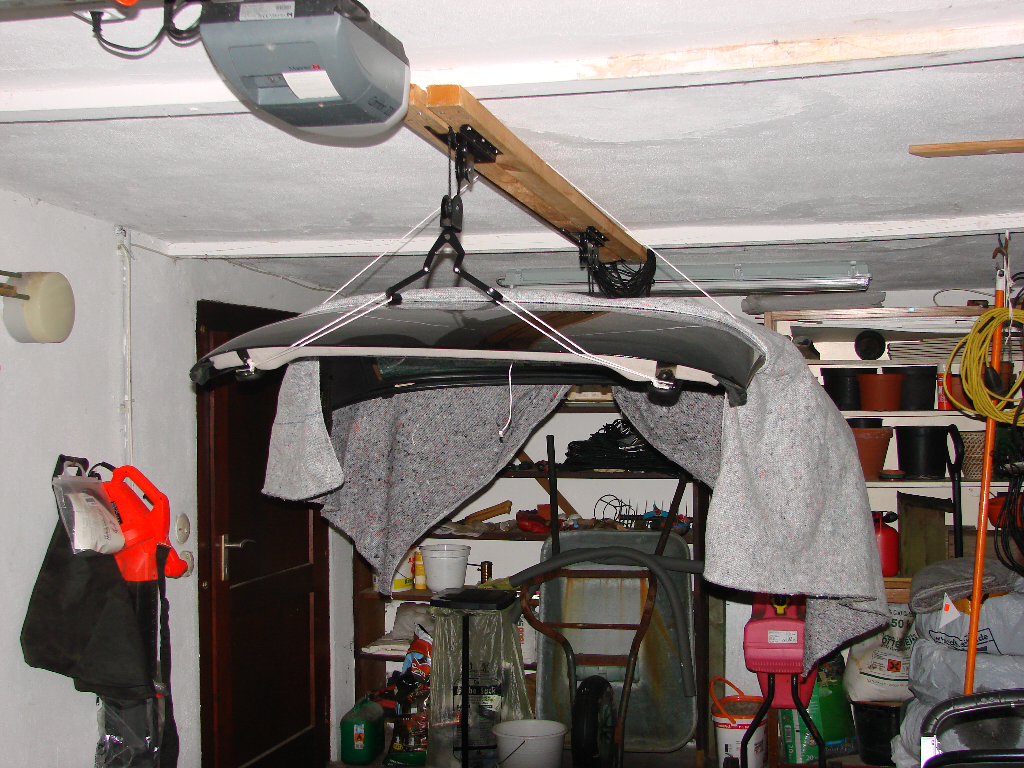 Pappe auf den Kofferraumdeckel legen, Scheiben runter und das Hardtop ist auch alleine zu montieren. Mein Top übersommert auf den Winterreifen an die Garagenwand gelehnt. Torsten |