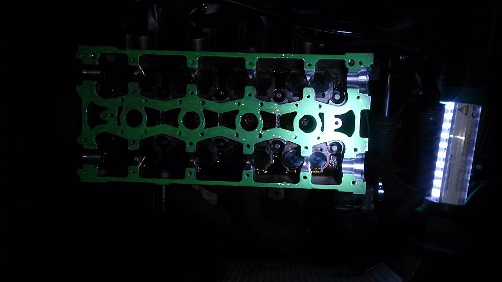 Peter und ich haben den Nockenwellenkasten neu abgedichtet. Dieses Mal weder mit Liqui Moly noch Marston-Domsel grün, sondern mit der guten alten GM Flächendichtung grün (die man auch für die Nockenwellenkästen der alten Kadetts etc. verwendet).