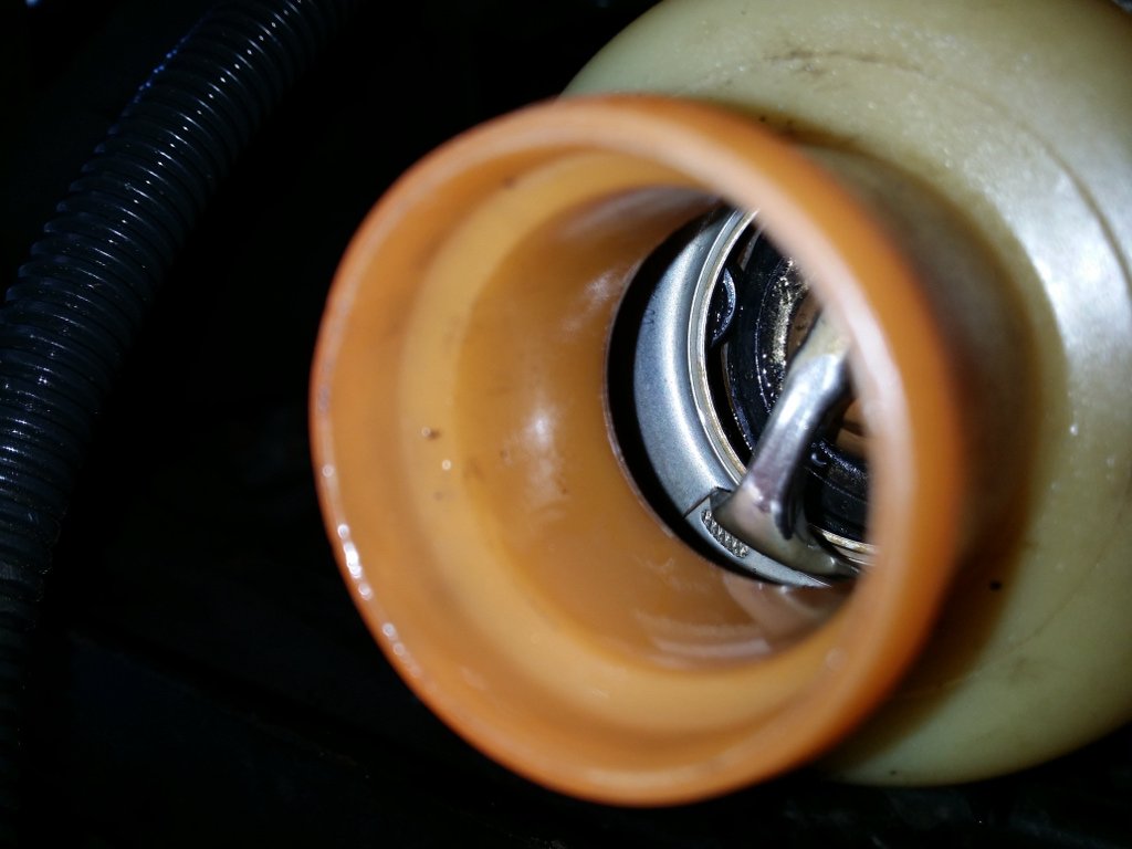 *grml* Statusbericht: - Auto steht hinten auf Rampen, darunter ist leidlich wenig Platz. - Die zum Ausgleichsbehälter führende Schelle war wohl nicht fest genug, jetzt weiß ich wie die Suppe schmeckt... süß. - Der Schlach vom Kühler ist runter, und ich hab den Überltäter gefunden (Bild im Anhang). Ich bekomm den so aber nicht raus, also PRT ausbauen... - Die Schläuche nach oben bekomm ich nicht ab. Vom ersten hab ich die Schelle hoch geschoben bekommen, aber der Schlauch sitzt so bombenfest auf dem PRT, ich bekomm den nicht ab. Irgendwelche Tricks die ich kennen sollte? - Dann wollte ich frustiert wieder zurück bauen und die Karre in die Werkstatt bringen... wie bekomm ich die Schelle wieder zurück? Mit der Rohrzange rutsch ich ab, Kabelbinder rutschen drunter,... ich weiß grad echt nicht weiter.