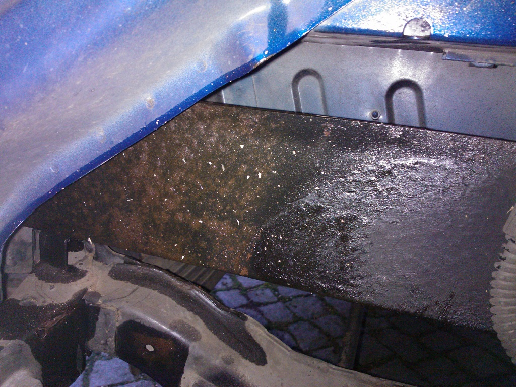 Ich würde kurzfristig erst mal versuchen so gut es geht im eingebauten zustand zu bearbeiten bevor ich den ganzen Hilfsrahmen gegen einen Pulver-beschichteten und Hohlraum-versiegelten tausche. Zur Zeit sind dort auch mehrere Schichten Owatrol drauf. Desswegen leuchtet es auf den Fotos (mit Blitz) auch so. Die Owatrol Schicht sieht aus wie ein Klarlack.