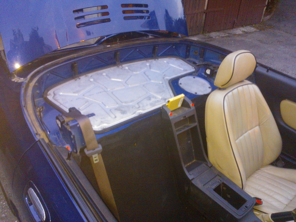 Kofferraumverkleidung und Beifahrersitz sowie alle nennenwerten Dichtungen sind schon draußen. Probleme bereitet mir die T-bar mit den Überrollbügeln.
