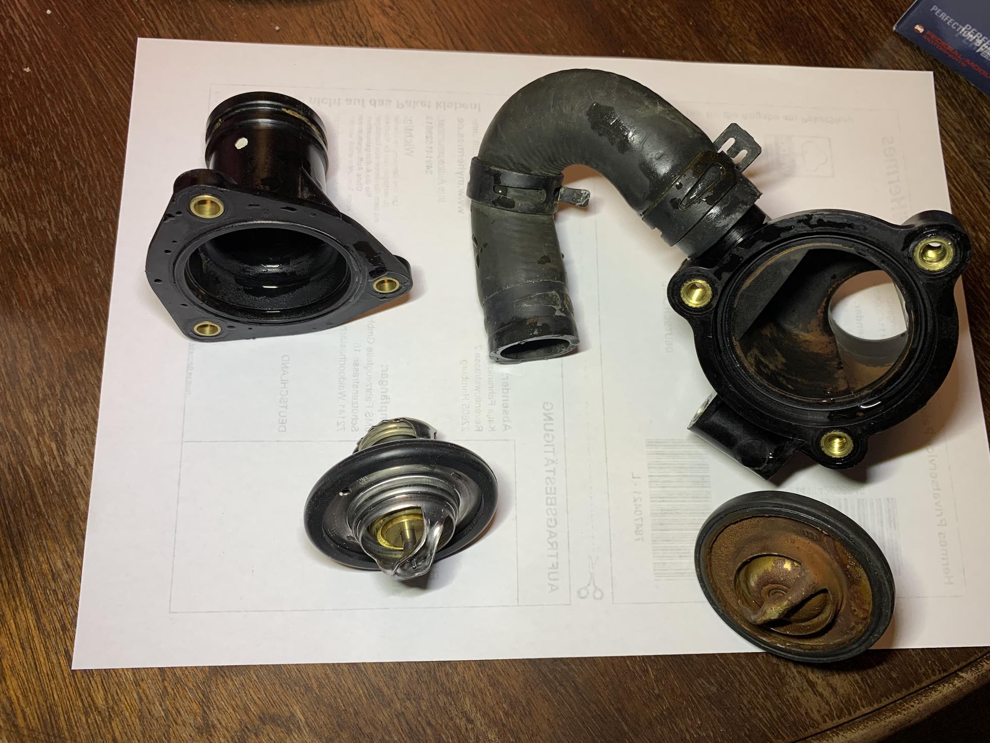 So, es geht aufwärts. Hab heuteden Kopf abgeholt, auf der schlimmsten seite ( Zylinder 1) bracuhte es 4/100 mm zum Planen, die lose Buchse ist allerdings #4. Um die hab ich mich noch nicht kümmern künnen, aber der Thermostat ist drein und die Rohre wieder festgeschraubt, das ging recht reibungslos (abgesehen von Schraube fällt runter, Auto muss nach vorn geschoben werden, Schraube findet sich wieder an, fällt wieder runter und rollt in den Gullydeckel.  Zum Glück ist G20 lange her und der Gullydeckel nicht mehr geschweisst. At the End it was in.