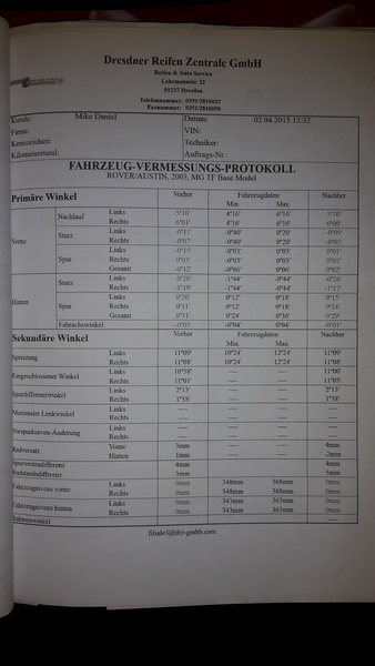 victor hat geschrieben: ... Das Auto wurde bei Mercedes auf ner anständigen Messbühne nach diversen Spurstangen und Lenkertausch vermessen. Ich war nicht dabei. Messprotokoll hab ich aber irgendwo mitbekommen, muss ich nachschauen. ..... Ähmm, seit wann kennt man sich bei Mercedes mit MG aus  die Anlage ist bestimmt gut, aber der, der da dran sitzt ... Egal, such das Messprotokoll und lads mal hoch.