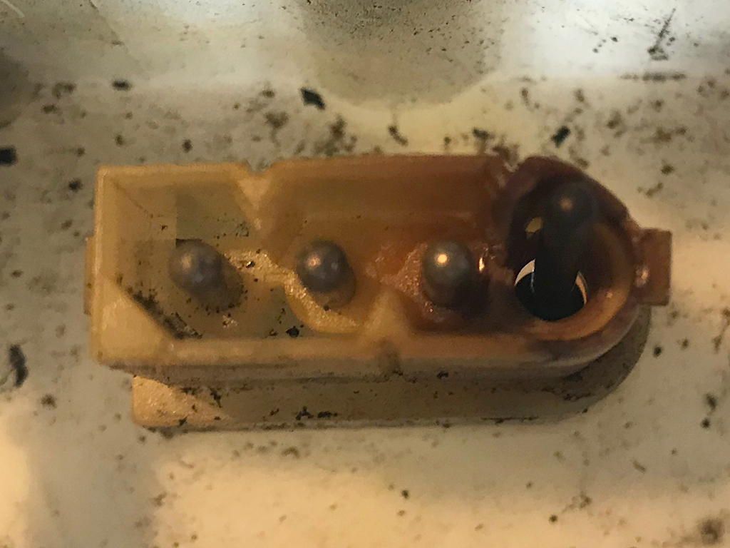 Oha, denk ich mir, da müssen wir doch mal ganz flott nach der Pumpe schauen. Ergebnis: Auch hier der Pin zum Pumpenmotor weggeschmort, dadurch Gehäuse undicht und potenziell brandgefährlich!
