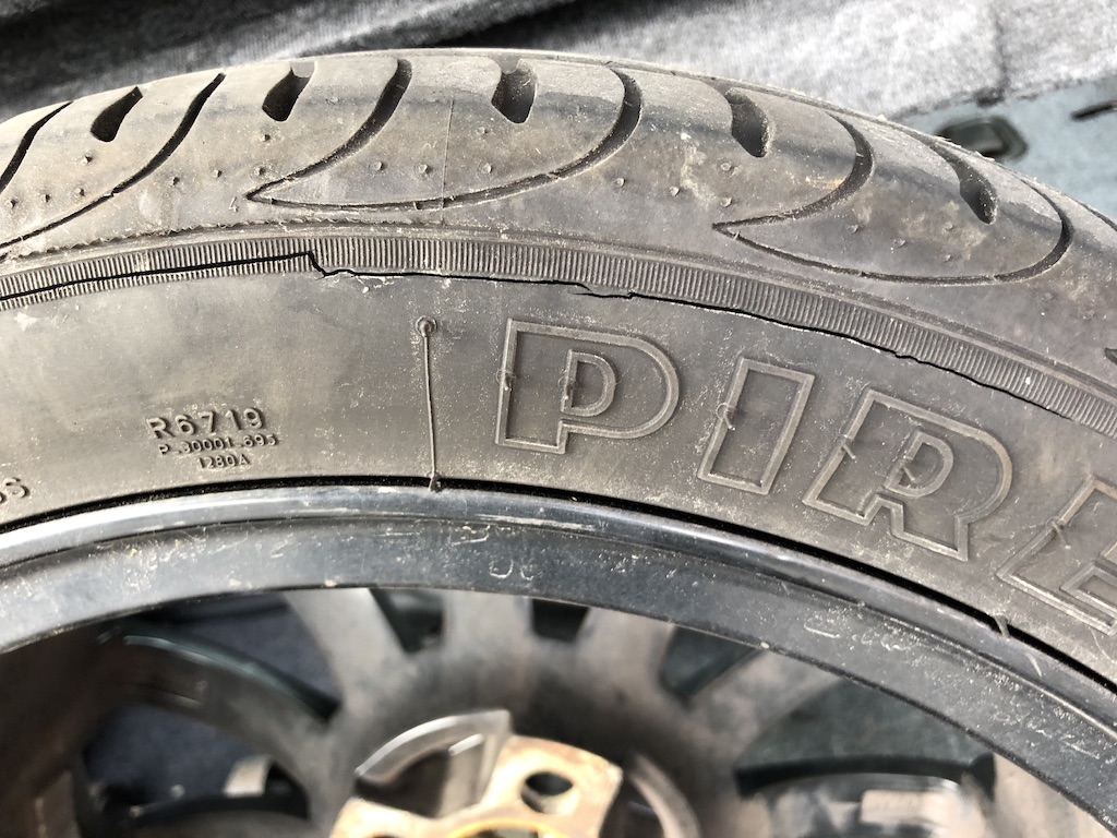 Da hatte ich doch gestern Abend noch ’nen Noteinsatz bei Adrian in Nörvenich. Hinterreifen links platt, bei der Sichtkontrolle fielen dann Risse an der Innenseite der Hinterreifen auf. Pirelli P-Zero Nero GT von 2013, also sechs Jahre alt. War bei der Vorbesitzerin Garagenfahrzeug mit Saisonkennzeichen, wenig Laufleistung.