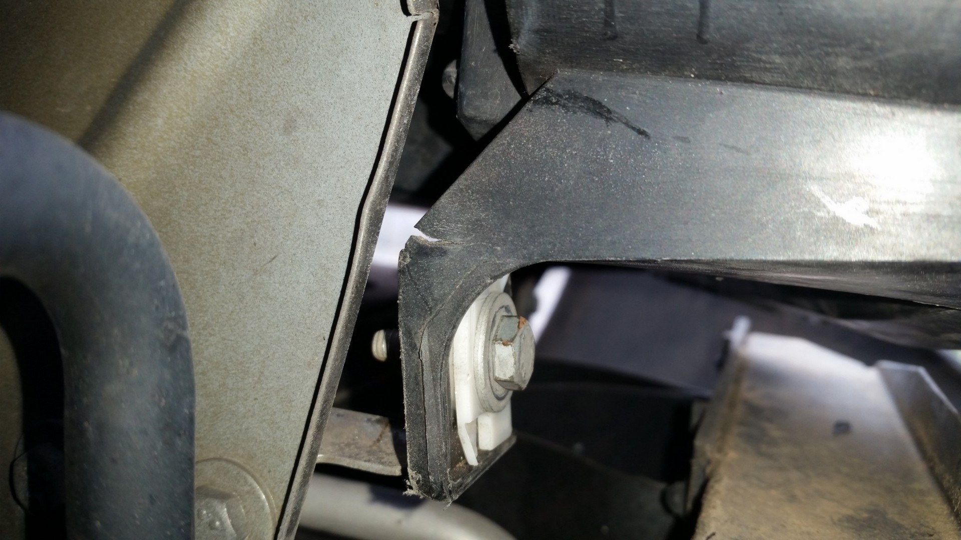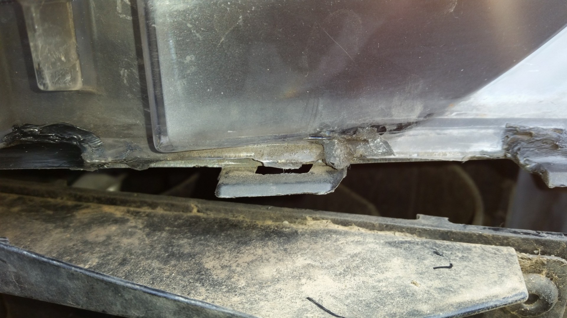 Einer der unteren Befestigungswinkel ist schon eingerissen und von der Scheibe eine Lasche ist gebrochen gewesen (nicht weiter dramatisch).