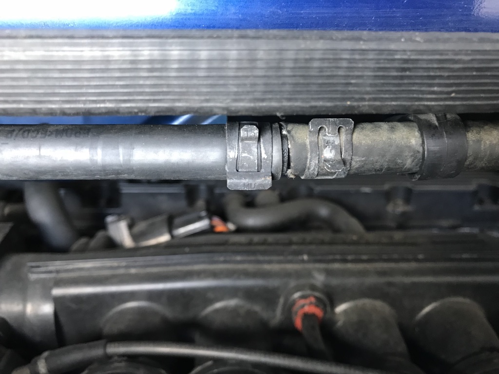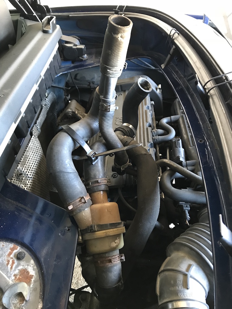 Den zweiten Schlauchsatz jetzt noch nicht einfädeln, erst den Heizungsanschluss machen. Der gehört an den (von hinten gesehen) linken Heizungsschlauch. Das ist da unten ziemlich eng, wo das PRT selbst nicht ganz unschuldig dran ist. Und dort heißt es dann, zwei Schläuche zu verbinden, die beide kaum Gegenhalt haben. Dateianhang: