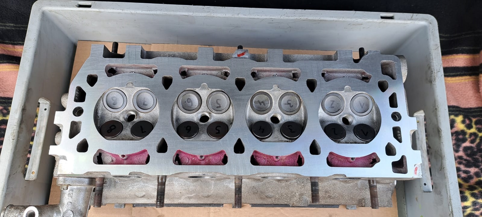 Diagnose:- Ich fahre zu wenig (die Ursache allen übels?) - ein Stehbolzen Abgaskrümmer war weg (huh?) - beide Kühlwassertemperatursensoren sahen so aus, als hätte es Wasser durchgedrückt - Edelstahl-Cat-Safer Nuts sind auch nicht das Wahre- 1 von 6 gerissen - irgendwer hat da Bosch Zündkerzen reingeschraubt - Ich habe sowohl Ölablassschraube als auch Ölfilter viel zu fest angezogen.... - 9 Liter Wasser / Öl-Gemisch kamen aus der Ölablassschraube => Zylinderkopfdichtung war eine original Rover LVB 00230 (womöglich sogar die erste?) => Zylinderkopfdichtung hat an der "klassischen" Stelle - "Church Doors" versagt, einmal ursächlich für die braune Flüssigkeit, ein zweites mal kurz davor (Versatz Dichtmasse) => Zylinderkopf i.O. (war klar, war ja nicht überhitzt) => Laufbuchsenüberstand ist ok, Buchsen scheinen fest, wird sich die nächsten 2x Wochen zeigen => Haarlinial zeigt, dass der Block in der Mitte etwas abgesackt ist (eher mehr Ansaugseite als Abgasseite) => Motor hatte schon "Steel Dowls" Wir haben jetzt vereinbart das folgendes gemacht wird:- Shirley BHS.753L Dichtungssatz (MLS Dichtung) mit 10,9er Schrauben und verstärkter Ölschiene => die ein oder andere unwesentliche Dichtung aus dem Satz wird wohl durch bessere getauscht (fragt mich nicht welche) - Zylinderkopf wird geplant, Ventilschaftdichtung neu, Ventile einschleifen (Motorenbauer) - Nockenwellensimmerringe neu (4x) - Wasserpumpe, Zahn- und Keilriemen neu - Öl + Filter + Kühlwasser neu - Flammrohrwinkel GEX13002 wird verbaut sowie neue Auspuffdichtungen (3x) - CowaCarParts Mk1 "Originalkat" wird verbaut - NGK Zündspule mit neuer Leitung zur Verteilerkappe + original Rover Zündkerzen - MG TF Verstärkungsstreben hinten verbaut - 2x neue Kühlmitteltemperatursensoren - 1x neue Lambdasonde ( nur auf Verdacht, kommt man niemals mehr ran) - MGMania Keilriemenspanner - Luftfilter Paar Bilder: Dateianhang: