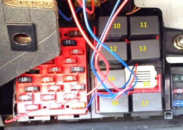 rausfinden, welches Relais für was zuständig ist. hab die einfach mal ab 10 durchnumeriert. Da wo ich die 12 hingetippt habe könnte das Heckscheibenrelais sein, wenn man's mit dem alten Foto auf der Site bei mir vergleicht ? Was fehlt dann an Platz 14 ? Edit Platz 15 Edit2: also Platz 15 = Nebelscheinwerfer vorn
