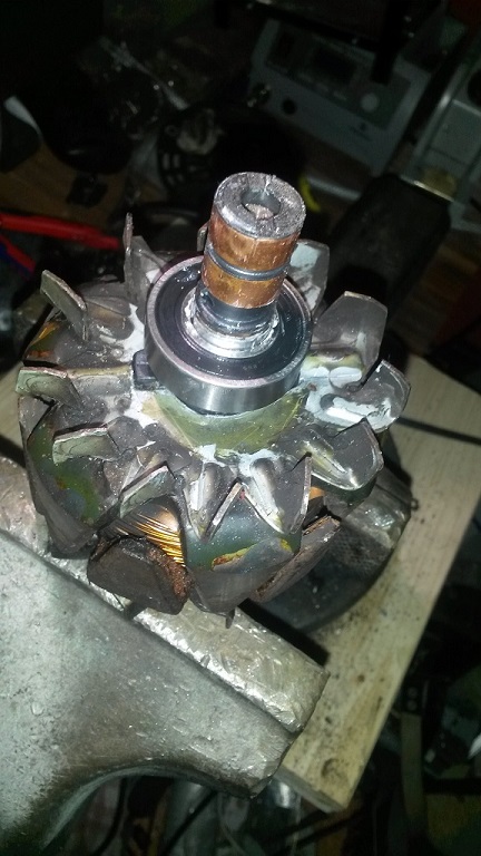 Welle auf der Seite wo der Schleifring saß erhitzen und neuen Schleifring aufschieben. Vorsichtig sie Kontakte an den neuen Schleifring einfädeln und dann anlöten.