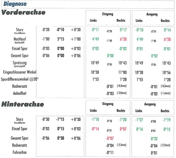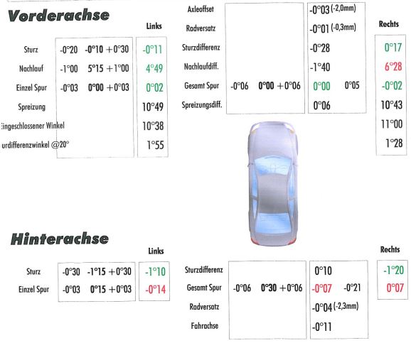 Heute also zum Spurvermessen und scheinbar keine große Veränderung an der Vorderachse nötig, aber an der Hinterachse Änderungen vorgenommen. Werde am Wochenende mal fahren und sehen wie´s ist, aber wollte vorher mal die Werte von Euch überprüfen lassen.