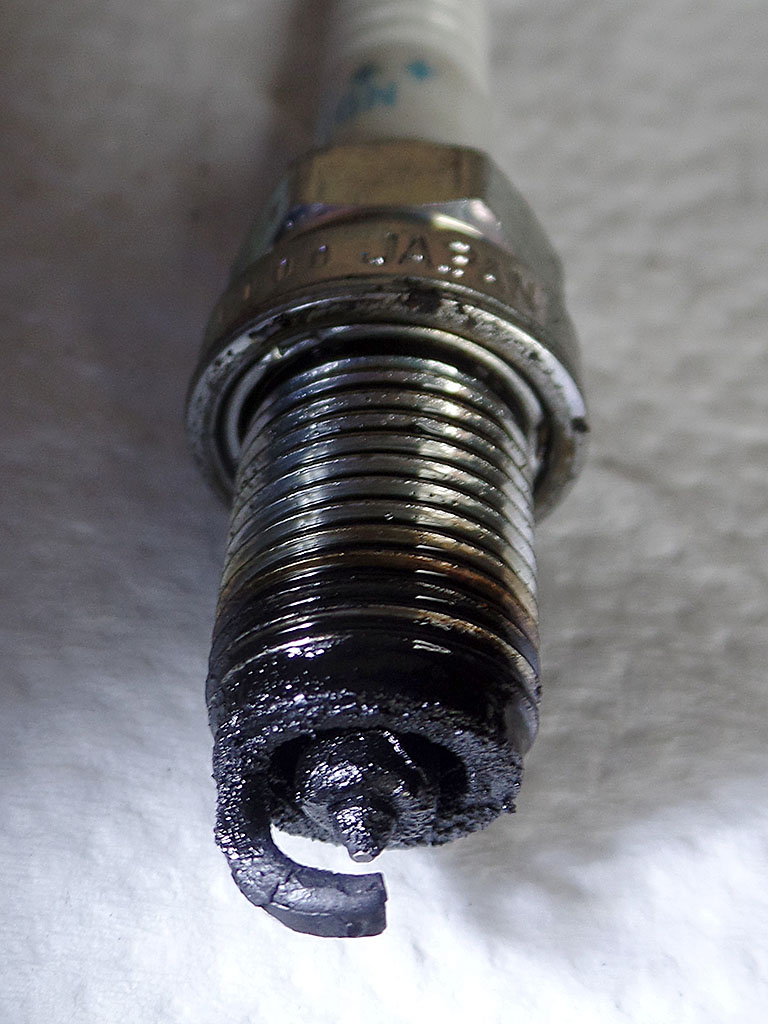 Und weiter im Text. Als ich heute für Caddes Projekt im Tausch die Injektoren, den Benzindruckregler und die fuel rail rausgeholt hatte, dachte ich mir, schau doch erstmal nach den Zündkerzen. Und die sehen allesamt recht grausig aus, wobei Zylinder 1 noch die „schönste“ hat: Dateianhang: