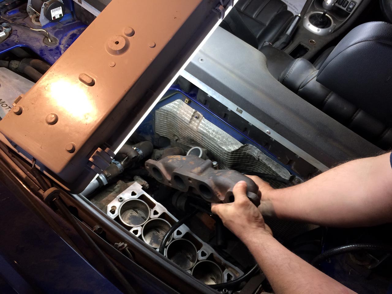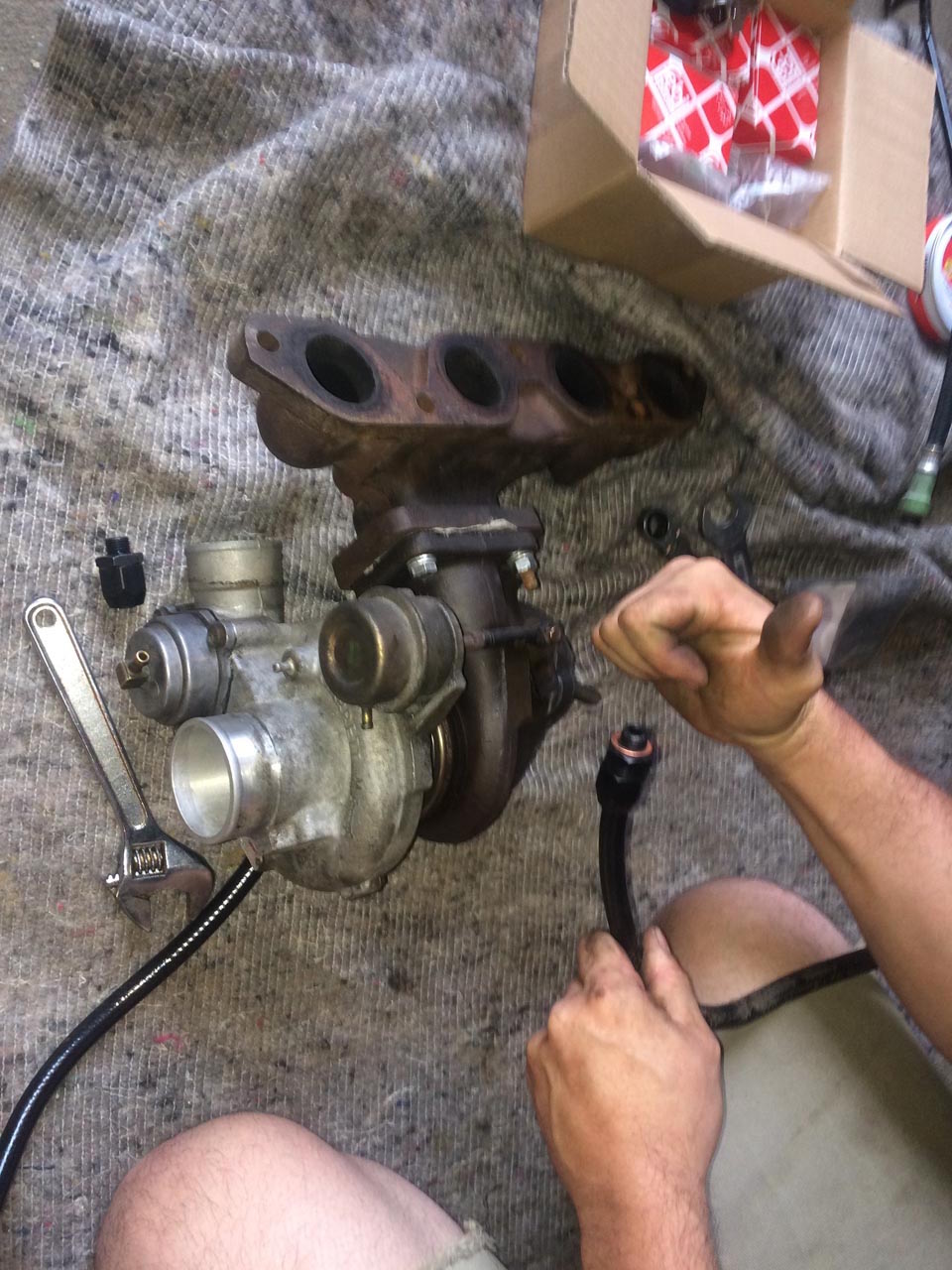 So, wir waren in den letzten Wochen nicht untätig! Es ist einiges passiert, als erstes wurde mal der Innenraum wieder komplettiert, d.h. alle Instrumente und die Mittelkonsole sind wieder drin. Im Prinzip ist der Wagen von daher “fahrfähig”  Leider vergessen Fotos zu machen, aber das ist auch alles noch viel zu dreckig. Vor ein paar Wochen haben Markus und ich dann den Lader mit dem Krümmer verheiratet (Gun Gum hilft  ) und das Teil reingewuchtet. Dann den Zylinderkopf wieder drauf und das war’s dann erstmal. Dateianhang: