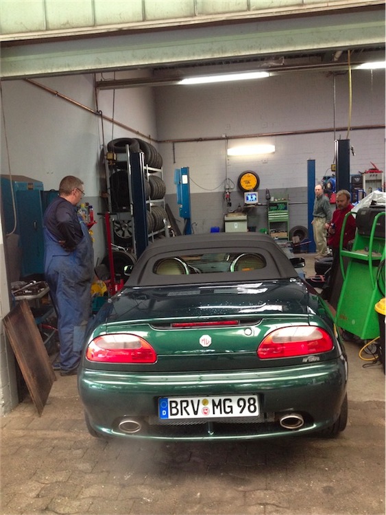 Yep Sebastian , ich komme wieder ! Sehr gern sogar !  Und sag Jana , mit ein paar Wochen so wie ich , ähem , das wird wohl eher nix, haha ... dafür fährt Sie den schönsten MGF , den ich bisher gesehen hab ! und nun zum Philipp .... JA, DICH HAT JEMAND GERUFEN hahaha ... Du kriegst gleich ne Mail ... LOL ! Ich hab einfach drüben mal gefragt , wie immer im Sesamstrassenmodus ..." wer nich fragt bleibt .... " Rob Bell An Ich Heute um 10:03 AM Hi there, great to hear from you  I guess the question is about fitting Rover's 1.8turbo engine? No engine bay modifications are required to fit - but you will need a new turbo manifold because the standard one brings the turbo down on top of the gear selector cables! Let me know how you get on  Rob Der gute Rob hat mir heut morgen ein geschmeidiges Lächeln aufs Gesicht gezaubert. Denn so wirklich Lust da im Innenraum alles rauszureissen und den Tank umzudengeln , hatte ich ich eigentlich nicht ! ( Natürlich ! ... ähem ... ) Allerdings nen neuen Abgaskrümmer selbst zu bauen/entwerfen , ist für mich allerdings NICHT drin ... er meint wohl , doch so einen a la KOOS ? , nach oben raus verlegen ... ? Es geht mir wirklich um ein Upgrade für lernwillige Doofies ohne Hardcore Geld durch den Schornstein zu jagen ... wie die Tommy´s sagen ... " on a budget " ... Nun zeigt sich, wo Gevatter Frost den Most herholt , denn davon sprach der, der mir diese Idee so schmackhaft gemacht hat , nämlich nicht ... Motor rein, raus isses nämlich scheinbar denn doch nicht ... STIG ? WIR ( ALSO ICH ) MÜSSEN NEN TURBO ABGASKRÜMMER BAUEN ? UNTERM CARPORT ; OHNE SCHWEISSGERÄT ; SO MIR NICHTS DIR NICHTS ; AUS DEM NICHTS !? KEIN PROBLEM ! ( könnt ein bisschen dauern , hahahaha ... ) Na das kann ja heiter werden ... ich sag den Stunt noch nich ab , denn der Norddeutsche Werftverbund könnte ja immer noch hilfreich sein ... sonst müssen meine Jungs vonner Wärft halt noch nen Turbokrümmer schweissen ... aber ohne Zeichnung und Maße issas murks ... Ideen ? Gear selector cables : verlegen ? Den originalen Turbo-Krümmer umbauen ? Vielleicht hat jemand auf der Insel ja ne Zeichnung vom Turbokrümmer ... ich frag mal ... Ohne Zeichnung vom Motor und deren Abmessungen is das ansonsten ein bisschen zuviel Schach ...