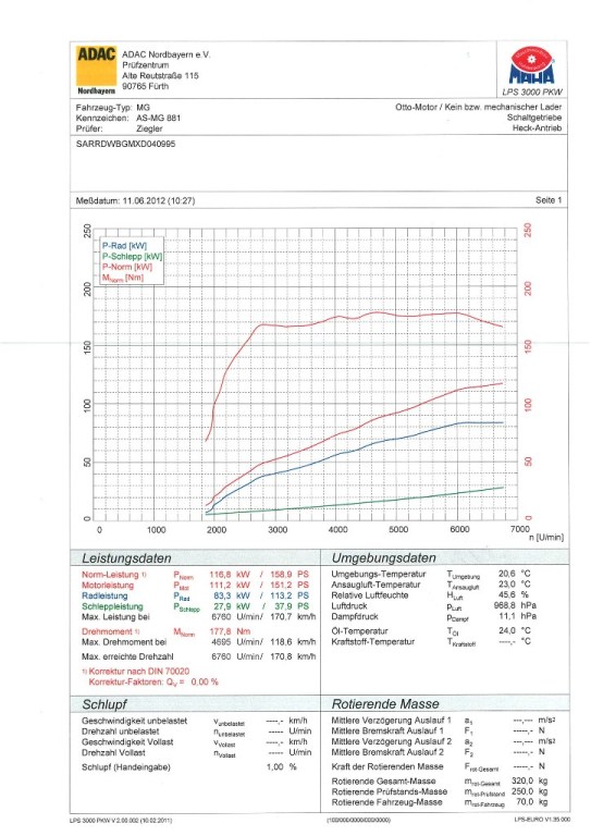 Hier mal der Ausdruck. Ich hab mich nun erkundigt da mir die Maxdrehzahl seltsam vorgekommen ist. Problem ist im Prüfstand gibt es unter MGF nur den MPI der bekanntlich ja nicht so hoch dreht, Die Drehzahl wird jedoch vom Prüpfstand errechnet und nicht direkt am Motor ausgelesen. Somit muss man ca 400 Umdrehungen dazu rechnen damit das stimmt.