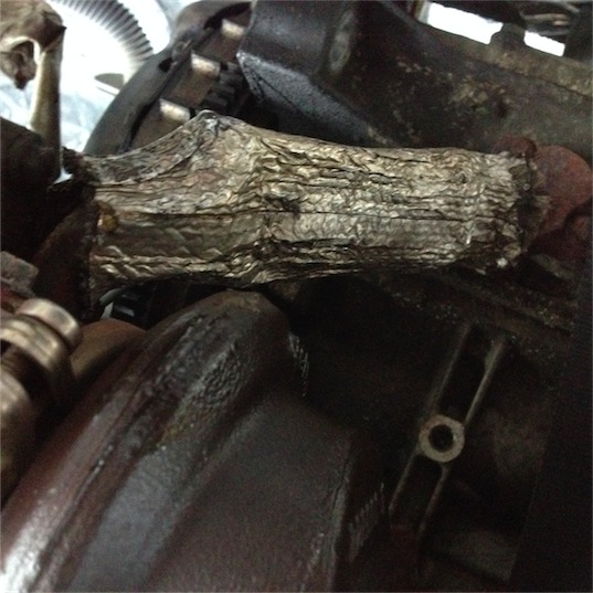 Ich mein, wenn man die Ölzulaufleitung zum Turbo mal nich am Block verlegt , dann kann der Turbo da bestimmt nen Ticken dichter dran. Ich glaub sogar beim "Blauen" ist das ne Schtahloflexleitung , wenn ich mich richtig erinnere ... und wenn an man dem Ölfilterhalter nen 90 Grad Bogen spendiert , dann kriegt man den Turbo sicher nen Stück in die Mitte UND nach unten, ohne das der Ölfilter dem im 76mm Auspuff da im Wege ist ... wenn manns sieht , ist echt das echt easy, da dran herumzupfuschen Dat geiht, sog i ! ( Ausser jemand , sagt geht nich , weil Du dit un dat vergessen hast zu beachten ...  ) Und dassas da drin SHITHOT wird, hier : die Plastikverkleidung ist geschmolzen : Dateianhang: