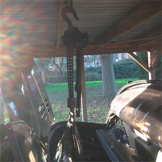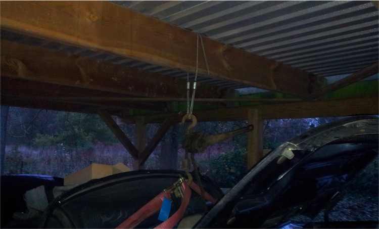 Leute , es gibt Tage die man so schnell nicht vergißt ! Und der heutige Tag nimmt definitiv einen der vorderen Plätze ein , in der Bestenliste in "the damn shit best garage in town" , hahaha ... Aber der Reihe nach ... Am Samstag Abend hatten Jan und ich noch ein Gespräch, in dem er mit sagte , das er nicht davon ausgeht, das wir den Motor da an einem Tag rausgfuddelt bekommen ... Ich : "na klar !" Nach dem Thorsten mir allerdings kurz nach der Ankunft sagte, das er seinen Motorkran "vergessen" hatte, dachte ich auch ... "oha , dat waard bannich eng" Und somit schauten wir schon besorgt zu den Balken des Carports hinauf ...  Dateianhang: