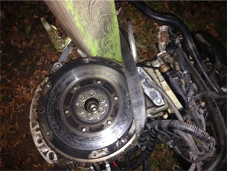 So, war klar ! Passt nich ! Passt überhaupt GOAR NICH ! Es muss definitiv die Kupplung vom Turbo inklusive Schwungscheibe abgebaut werden. Punkt aus ! Lässt sich nicht transplantieren. Ich eben allein versucht die Schwungscheibenschrauben zu lösen, da hat sich der gesamte Motor immer mitgedreht , uhhhh .... ich ihn zur Strafe erstmal am Carport festgeschnallt ! hehe ... Dateianhang:
