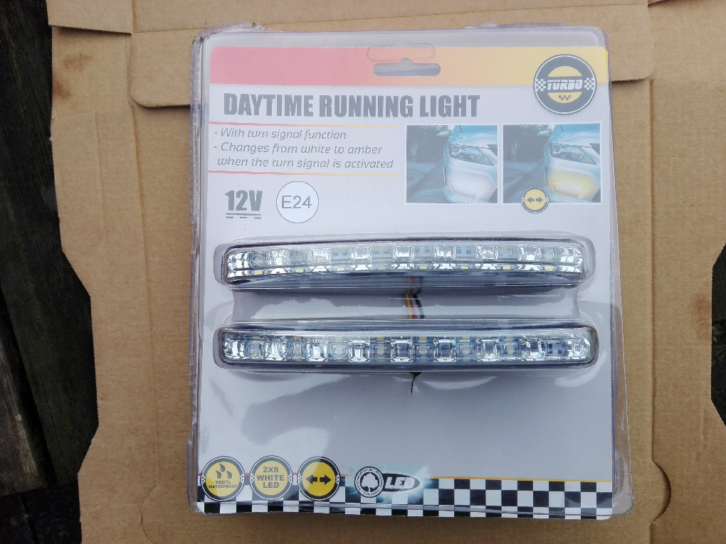 Die ganze Nummer lautet: DRL PAV-08C. Mit etwas Mühe habe ich den Inverkehrbringer herausgefunden, der aber wohl nicht an Endverbraucher verkauft; zumindest sind auf seiner Website keine Preise angegeben. Leider kann man sie direkt aus der Verpackung nicht ohne weiteres verwenden, da sie nicht merken, ob das Standlicht brennt oder nicht. Man muß also noch ein Ruhestromrelais dazwischen schalten, das vom Standlich angesteuert wird. Die Blinkerfunktion kann man nur verwenden, wenn man den vorderen Blinker abschaltet (bzw, über einen Wechselschalter laufen läßt, der zwischen dem DRL-Teil und dem autoeigenen Blinker umschaltet). Als Blinker zugelassen scheinen sie nicht zu sein. Aber wer merkt das, außer der sorgfältige aaSoP bei der HU nach § 29 STVZO?  Ich habe für das Wunderwerk der Technik knapp 8 € (für 2) bezahlt. Ob sie dafür noch zu haben sind, kann ich herausfinden.