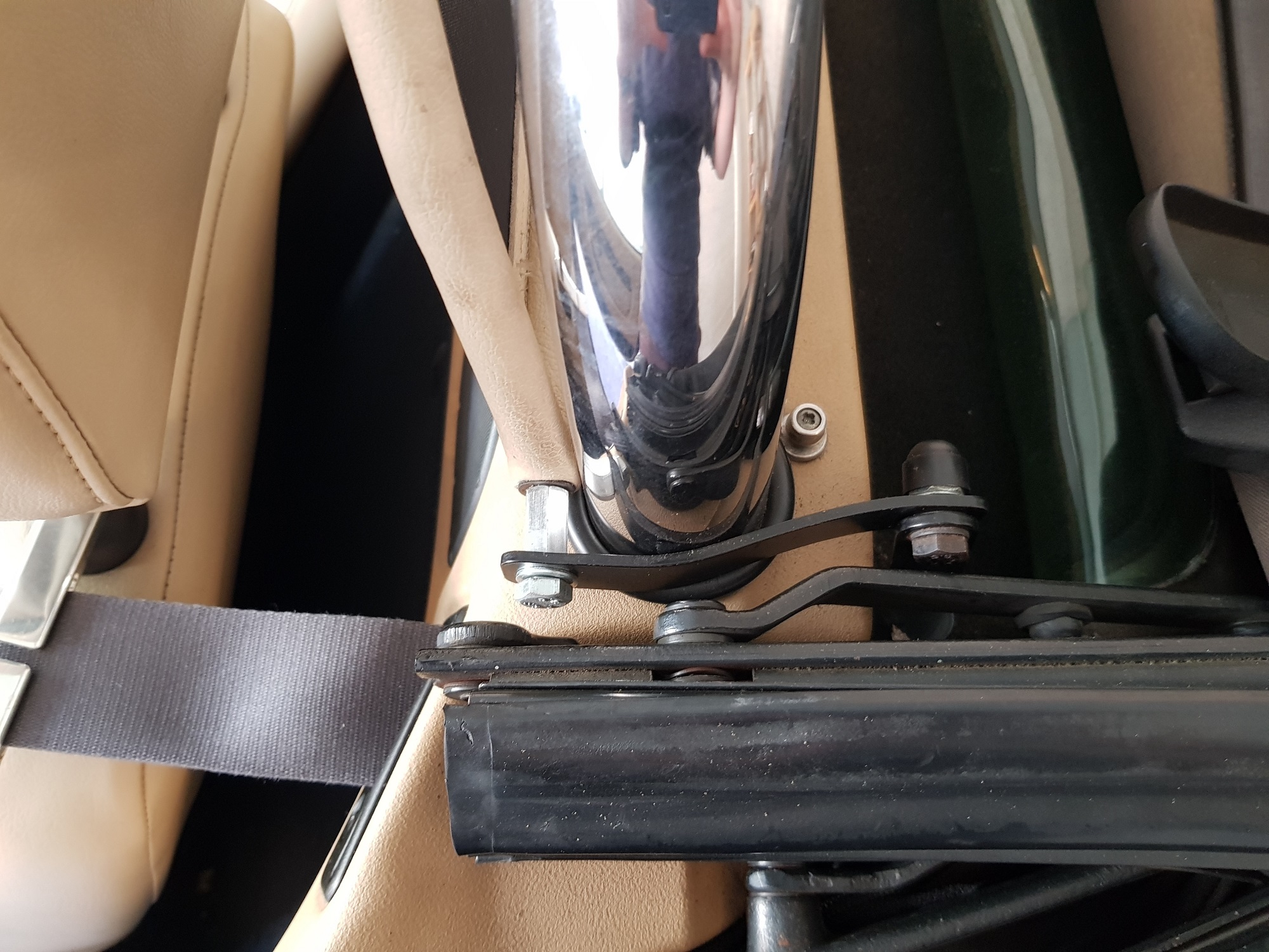 Halterungen gerbogen und Distanzmuttern an das original Windshot ( RP1502BISCUIT). Überrollbügel sind die, diese durch die T-Bar gehen (original Rover Zubehör?) Grüße aus Chemnitz