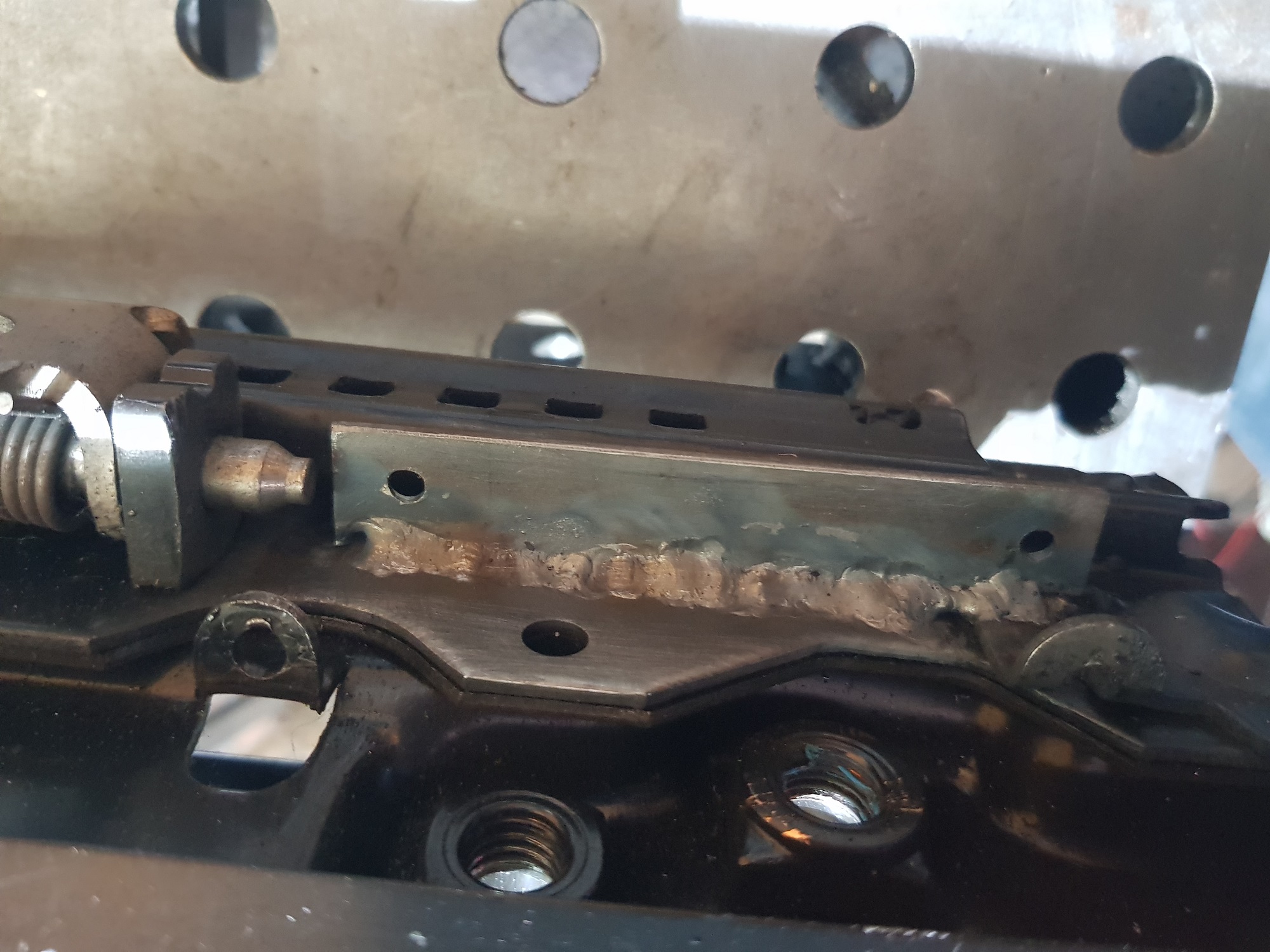 Die Gestelle sind beide Unterschiedlich verzogen, daher musste ich Sie durch mein Gewicht für die Messungen niederdrücken auf alle 4 Aufnahmen. Bitte nicht wundern das die Maße nicht einheitlich sind, durch die Aufnahmelöcher im MG sind die Sitze auf ebener Fläche nicht gerade. Man kann nur die Absolutwerte vergleichen. => In Summe 1,5 bis 2 cm tiefer das VHS Gestell. A bit of reverse engineering...=> Die Bleche wurden wie oben angedeutet im Knick eingeschnitten/ eingeflext. => Dann wurde am eingezeichneten blauen Kreis eine starke Kombizange oder ähnliches angesetzt um die Dreiecksbleche maximal nach unten zu biegen bis sie an den Sitzschienen nahezu anliegen. => das Schräge Blech wurde dann stärker nach unten gebogen, dabei wurde es nicht wesentlich verlängert wie ich erst dachte. (Länge bleibt ungefähr gleich zur Front). => Dann wurden offenbar Dreiecksbleche wie oben eingezeichnet eingesetzt. Längendifferenz durch 2 ergibt eine Breite des Dreiecksblechs von ca. 1,5 cm (geringe Überlappung zum Schweißen vorhanden und ggf. auch notwendig). => das ganze wurde dann verschweißt => Hinten wie oben bereits beschrieben 2x 2mm Bleche angeschweißt. Ich werde im nächsten Schritt mal meinen Fahrersitz aus dem MG ausbauen und schauen ob da ggf. Spiel für eine noch größere Tieferlegung wäre bzw. ob ich inkl. Federn am VHS Gestell schon am Fahrzeugboden aufsetzte... Weil dann gäbe es für Schwergewichte wie mich kein Optimierungspotential mehr. Bilder folgen... Grüße aus Chemnitz