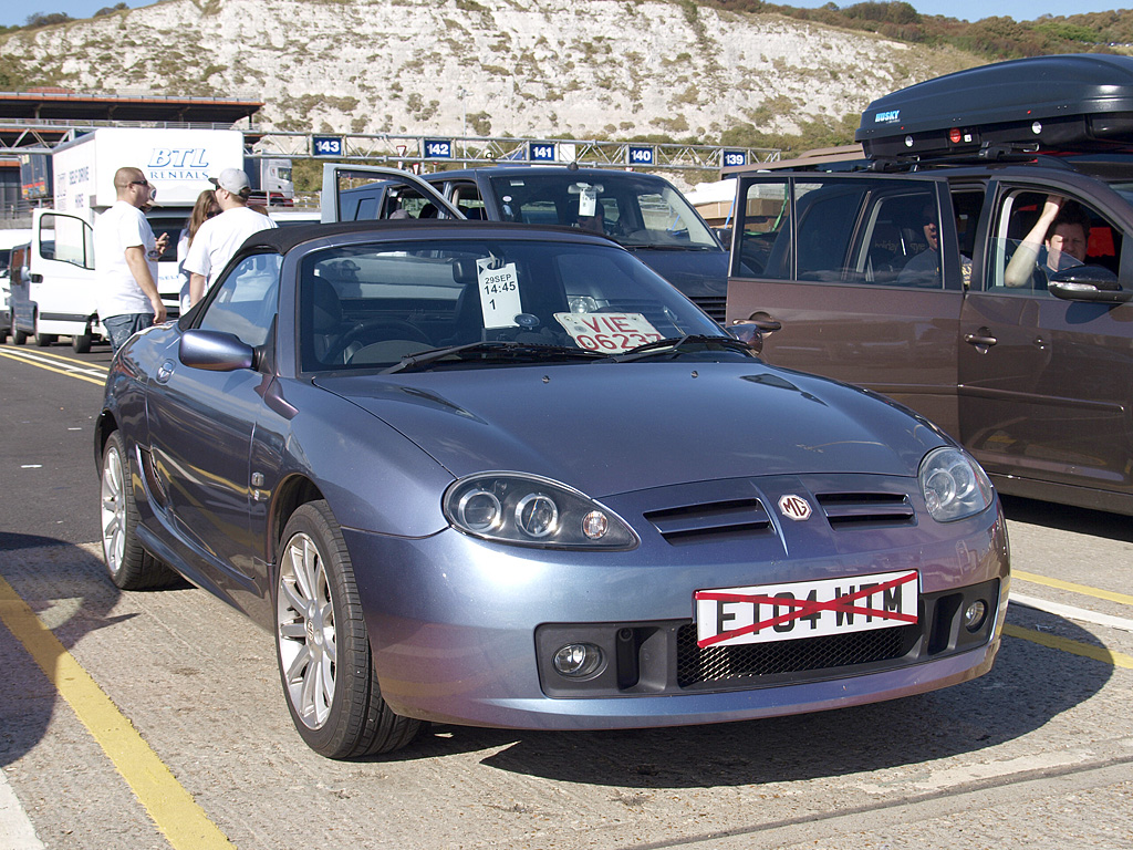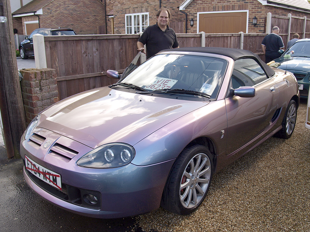So, da ihr ja alle neugierig seid, warum ich meine grüne Prinzessin verkaufen will ... Ich bin seit einer halben Stunde wieder zuhause und – wie früher beim Sandmännchen heißt es: "Nun, liebe Kinder, gebt fein acht, ich hab’ euch etwas mitgebracht!" Natürlich nicht euch, sondern mir, und jetzt haltet euch fest: Der Mykel hat sich ’nen TF gekauft !Frei nach dem Motto, was geht mich mein dummes Geschwätz von gestern an. Der Wagen fährt super, auch nach 250 km belgische Autobahn sind noch alle Zähne drin, technisch soweit feststellbar richtig gut, bis auf einen größeren und ein paar kleinere Macken. Die größere ist eine neue Benzinpumpe, die wohl nicht ganz dicht ist, wenn der Tank voll ist, stinkt es bestialisch nach Sprit. Aber nur im Stand, nicht während der Fahrt. Jetzt (1/3 voll) geht es wunderbar. Ansonsten noch ein fehlender Grill im Lufteinlass links, eine fehlende Klappe an der Sonnenblende links, ein loser Heizungsregelknopf (gebrochen). Untenrum wenig Rost, soweit ich sehen konnte, vier verschiedene Reifen. Zwei winzige Steinschläge auf der Haube vorn. Nur ein Schlüssel samt FB. Nun zu den Daten: TF 135, vom Band gerollt am 18.6.2004, erste Zulassung am 29.6.2004. Eine Vorbesitzerin. 45.534 Meilen (~73.200 km) gelaufen. Kopfdichtung (MLS), Zahnriemen usw. frisch gemacht. Große Bremsanlage, Nebler, Vollleder schwarz. Keine Klima. Und das Beste zum Schluss: Die Farbe ist Monogram Spectre (IAA), wurde genau 64 x gebaut (meiner ist der vorletzte), davon 36 x als 135-er, alles RHD, nie auf den Kontinent exportiert. Dürfte also hierzulande der einzige seiner Art sein. Da konnte ich einfach nicht dran vorbeigehen. Hier mal zwei Bilder von heute: