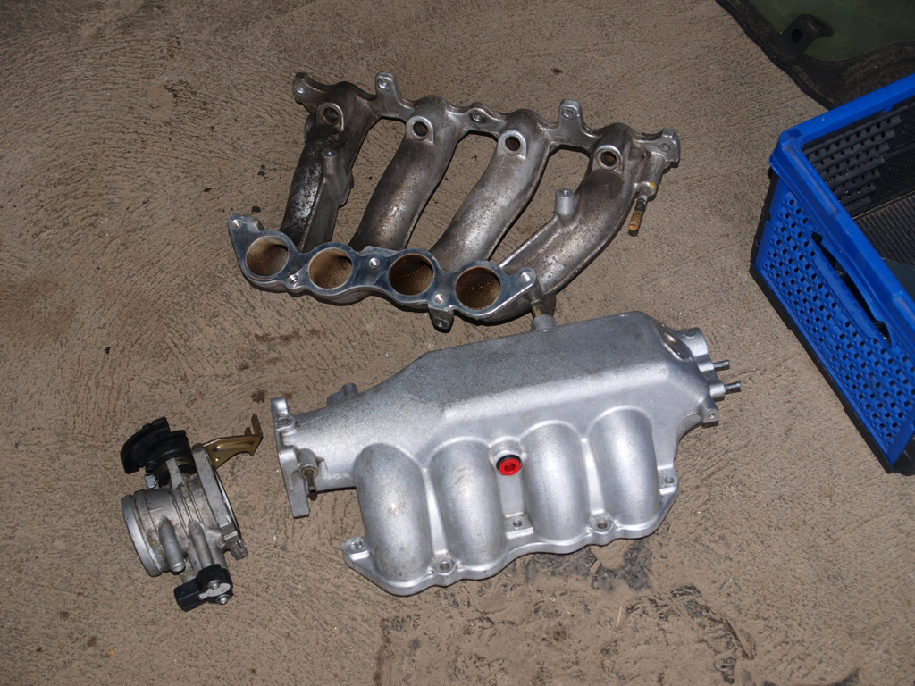 Dann das nächste Problem: Wie kriegt man das Teil bei eingebautem Motor raus? das letzte Mal hatte ich so eine komplett samt Zylinderkopf rausgenommen, kein Problem, aber wenn der Kopf im Weg ist … und hintenrum war auch nichts zu machen. Die Lösung war, den Aktivkohle-Kanister zu lösen und den Deckel vom Luftfilter zu entfernen, da kann man das Teil dann durchfriemeln, links am Motorblock vorbei. Vorher aber das Leerlaufregelventil und den MAP-Sensor abschrauben, sonst klemmt’s gewaltig. Und nun war Platz da für diese schicken Teile: Dateianhang: