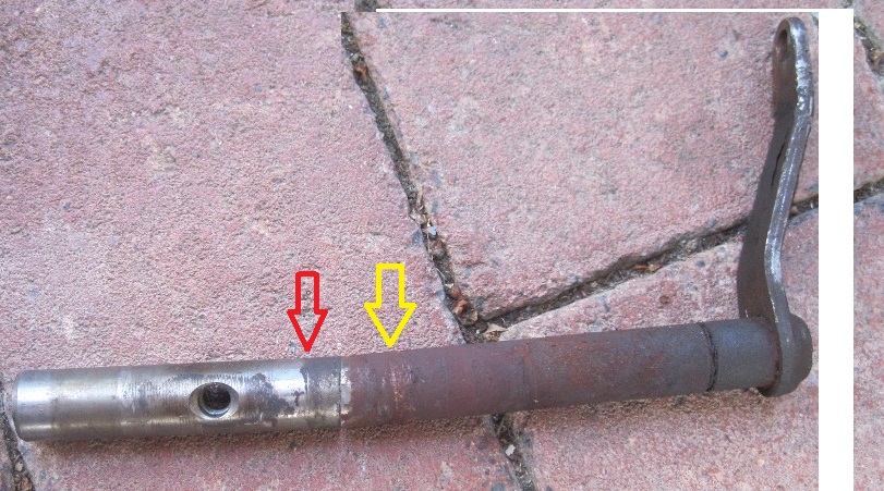 Das sehe ich so ähnlich. Ich denke der von mir gelbe Bereich ist dort, wo die Gabel sitzt, der blaue Bereich (vielleicht net ganz so lange) sitzt in der Bohrung des Gehäuses und der rote Pfeil könnte eine Nut für einen O-Ring sein. Der Hebel schaut ja nur ganz wenig aus dem Gehäuse. Wenn der O-Ring defekt ist, dann dringt dort Wasser ein und verrottet die Bohrung, allerdings könnte auch der Rost von innen entstehen (eher unwahrscheinlich) oder beides. Wenn dann die Bohrung total und durchgehend vergammelt ist, dann hilfts natürlich wenig mit WD40 oder anderem Zeugs. Das dauert dann viel zu lange bis das wieder gängig wird.