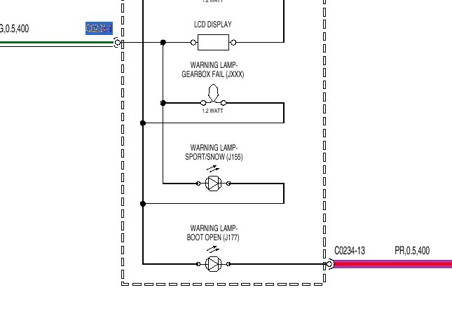 Die Kontrolleuchte für Schneeschaltung (C0234) wird durch ein PDM-Signal vom ECM (C0914) gesteuert, das der Instrumentenblock über ein Kabel weiß/grün empfängt. Dieses Signal steuert auch die Schaltstufenanzeige im im Kilometerzähler und die Getriebewarnleuchte.