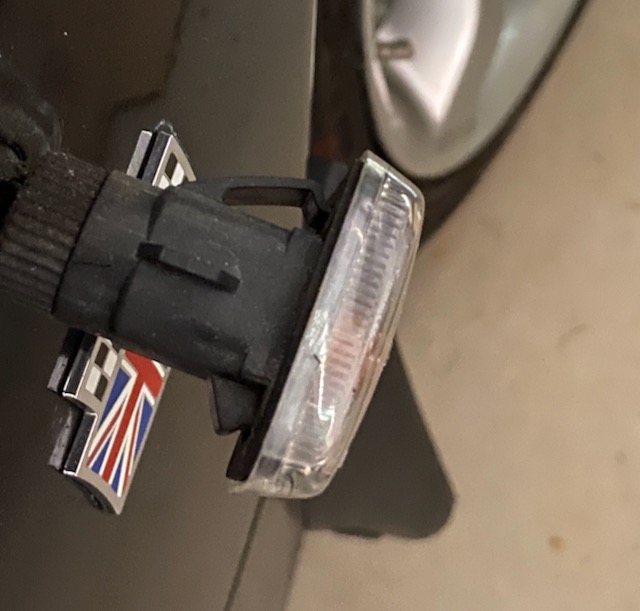 Da gibt es keine Mutter. Die Seitenblinkleuchte wird eingerastet. Vielleicht ist das federnde Kunststoffteil abgebrochen.