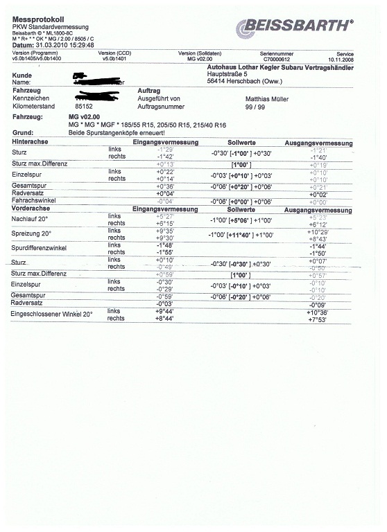 Hi Marlon, das Vermessungsprotokoll ist wirklich teilweise merkwürdig, da sind bei der Ausgangsmessung einige Werte weiter vom Soll ab als vorher. Muss vielleicht mal einer ran, der das richtig kann und nicht nur japanische Allradschleudern zurechtdengelt. Nebler = schöne Sache Sitzheizung = nett, wenn man im Winter topless fahren mag (wie ich) Hardtop = gut zu verkaufen, wenn man im Winter topless fahren mag und das Verdeck dicht ist (wie meins) keine Klima = im Cabrio imho sowieso Kokolores Lackproblem? Würde ausgiebiges Polieren/Wachsen helfen oder gibt es tiefe Kratzer? Motor lauter? Inwiefern? Ich war erstaunt als ich heute den Wagen mit nun korrekt montiertem Ansaugkrümmer wieder bekam. Musste echt das Radio leiser drehen ... der hat vorher offensichtlich reichlich Nebenluft gezogen, das klingt im Extrem wie ein alter Käfer und würde auch den schlechteren Durchzug erklären. Öltemperatur bei 120°C? das ist beim MY 2000 Standard, meiner schafft auf der Autobahn fast 140°  . Ist einfach das falsche Schätzeisen zum Sensor.