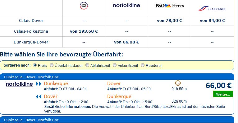 Habe gerade auch nochmal bei P&O (poferries.com) nachgeschaut, eine Buchung ist halbwegs günstig (40-55 EUR) bis einen Tag vorher möglich. Also iPad mitnehmen und offenes W-LAN suchen Bei DFDS (der einzige der Dünkirchen anfährt) habe ich die Erfahrung machen dürfen, dass ein Hin- und Rückfahrticket fast das gleiche kostet wie ein einfaches Ticket von Dover nach Dünkirchen ... auf derselben Fähre! Waren mit einem Auto drüben um einen F abzuholen. Dazu kommt noch, dass bei DFDS die Trips Dover-Calais grundsätzlich in GBP abgerechnet werden, was dann noch Aufschlag wegen Fremdwährung kostet Gruß Mykel